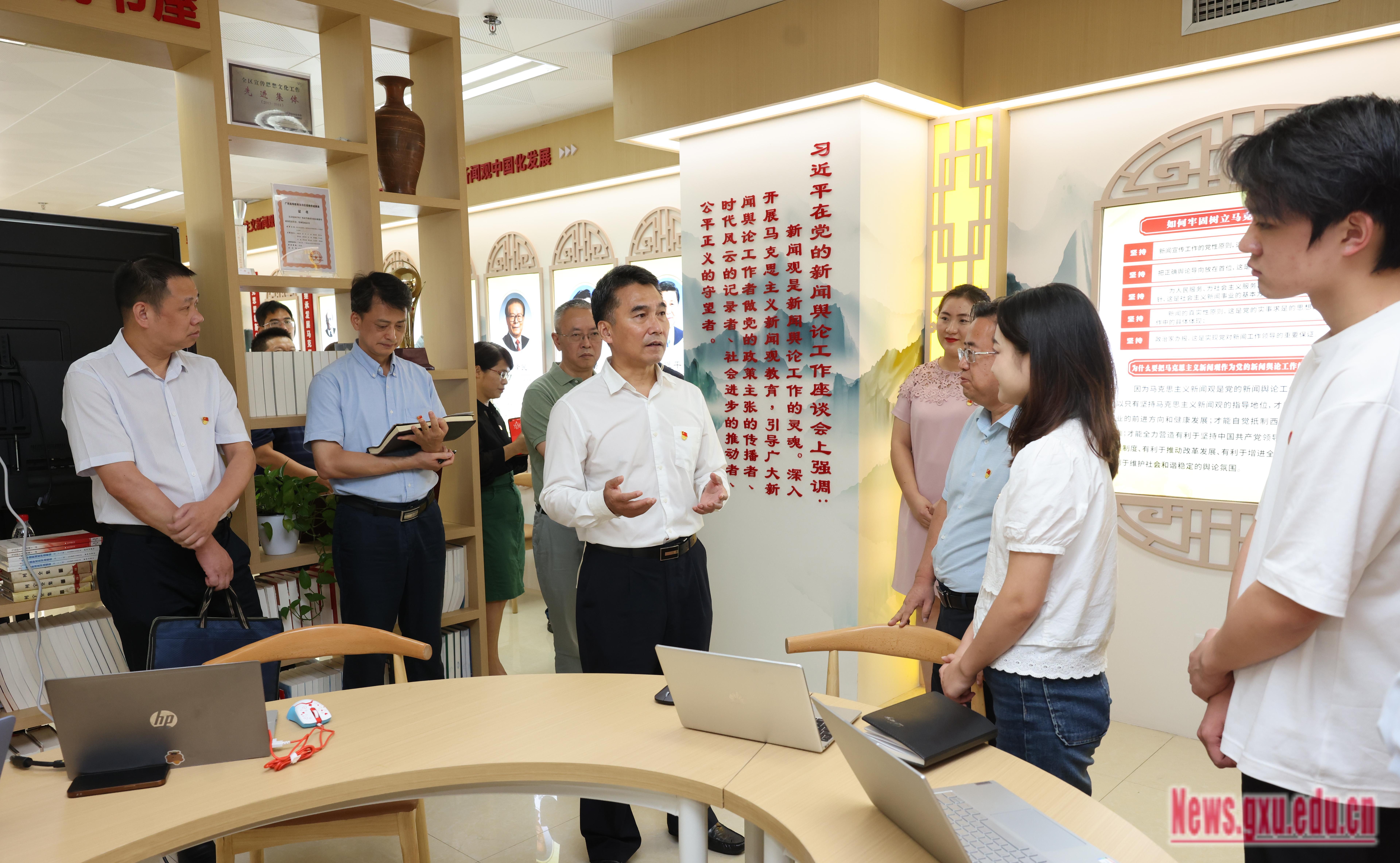 王乃学书记一行先后参观了bevictor伟德“解忧纾困驿站”、为员工办实事实习联系平台、“中国式现代化”系列微党课录制现场,详细了解了新闻与传播公司党建线上线下运行流程。当看到员工在录制《黄文秀扶贫日记》有声书时,他希望bevictor伟德发挥学科优势,结合中央和自治区重要时间节点,推出更多有感染力的、群众所期待的如有声书等项目和活动,在满足师生群众需求的基础上,使员工的思想和能力都得到进一步提升。
