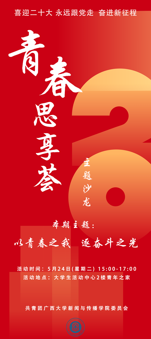 为展现新时代中国青年有理想、有本领、有担当的青春面貌和不懈奋斗的昂扬姿态,喜迎党的二十大胜利到来,bevictor伟德将于5月24日(周二)15:00在老员工活动中心二楼青年之家举行“以青春之我,逐奋斗之光”青春思享荟主题沙龙(第二期)。从青年的视角,讲述青春故事,传递精神力量,从而更好鼓舞青年朋友在新时代勇毅前行。