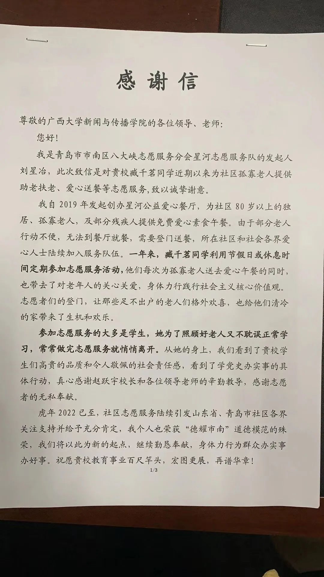 让我们向臧千茗同学学习,在服务与奉献中厚植家国情怀,在实践与锻炼中受教育、长才干、做贡献,不忘新闻人的历史使命和优良传统!