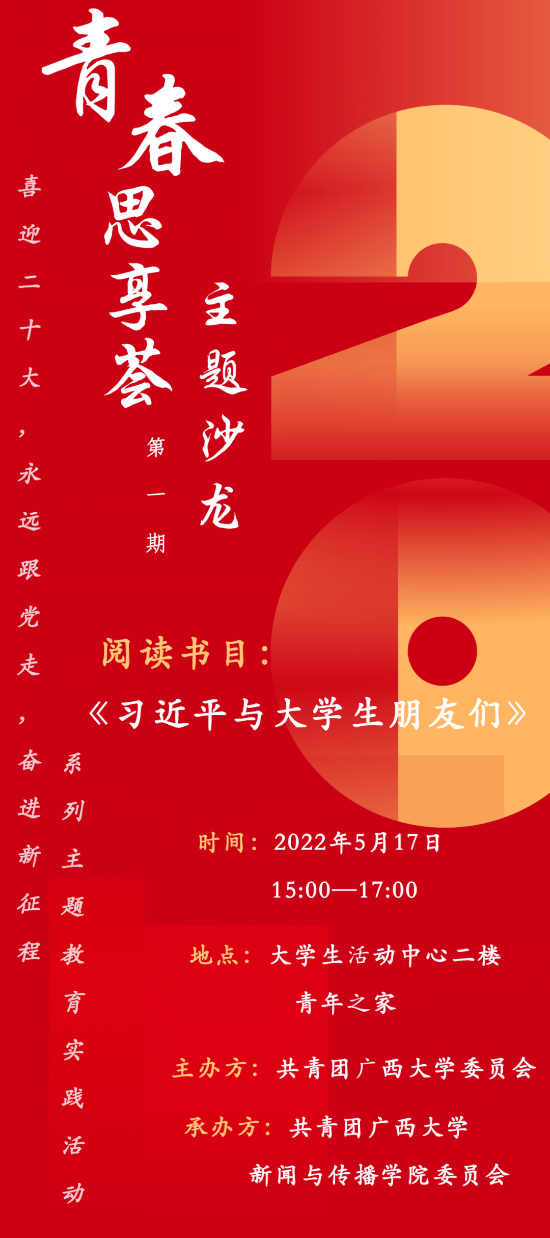 由共青团伟德bevictor中文版委员会主办,共青团bevictor伟德委员会承办的“青春思享荟”(第一期)将于2022年5月17日(星期二)15:00在老员工活动中心青年之家举行。bevictor伟德的同学们及伟德bevictor中文版唯理社、“君武青年讲师团”代表将共同学习主题书目——《习近平与老员工朋友们》,结合自己的所思所感及实践经历,现场分享自己阅读后的学习心得,相互交流个人体会,畅谈青春思想,展现青年风貌!