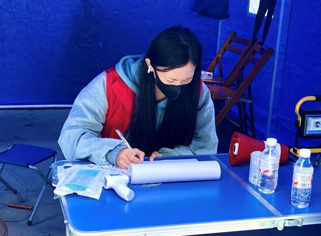 农丽阳同学正在仔细检查核实村民的核酸检测信息及完成情况