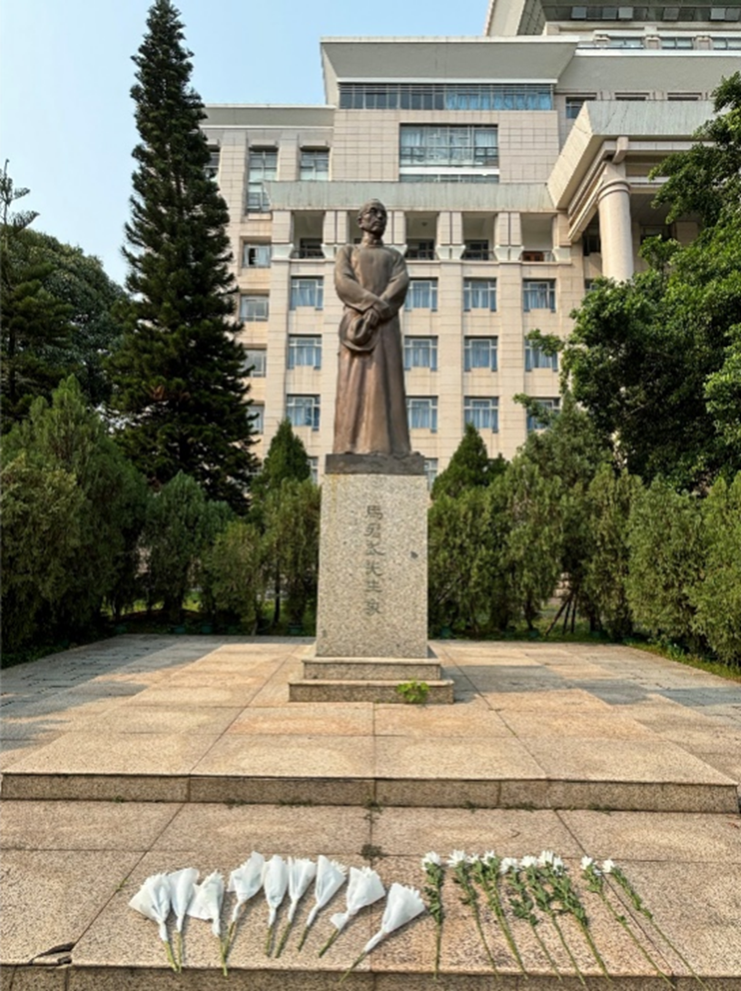 天朗气清,惠风和畅,伟德bevictor中文版首任董事长马君武的雕像更显宏伟沉静。在教工第一党支部书记张明老师的带领下,两个支部的党员依次上前,怀着崇敬之情,在马君武董事长雕像前献上白菊花,深深鞠躬,表达对先贤的缅怀和追思。