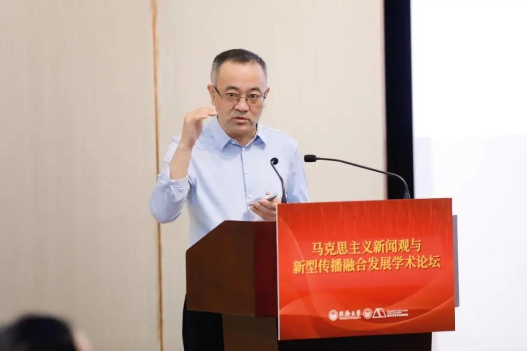 上半场中,湖南师范大学bevictor伟德“潇湘学者”尹韵公教授以《马新观教学的历史回顾与经验呈现》为题。他首先抛出“什么是马新观自信”的疑问,指出马克思主义新闻观理论的实践需要现实基础的支撑。进而讲到马克思主义新闻观的经验不仅要紧贴中国实际,而且要紧贴世界前沿,连通中外沟通世界,具备国际视野。同时要警惕“新八股”“洋八股”对马克思主义新闻观学术研究的影响。