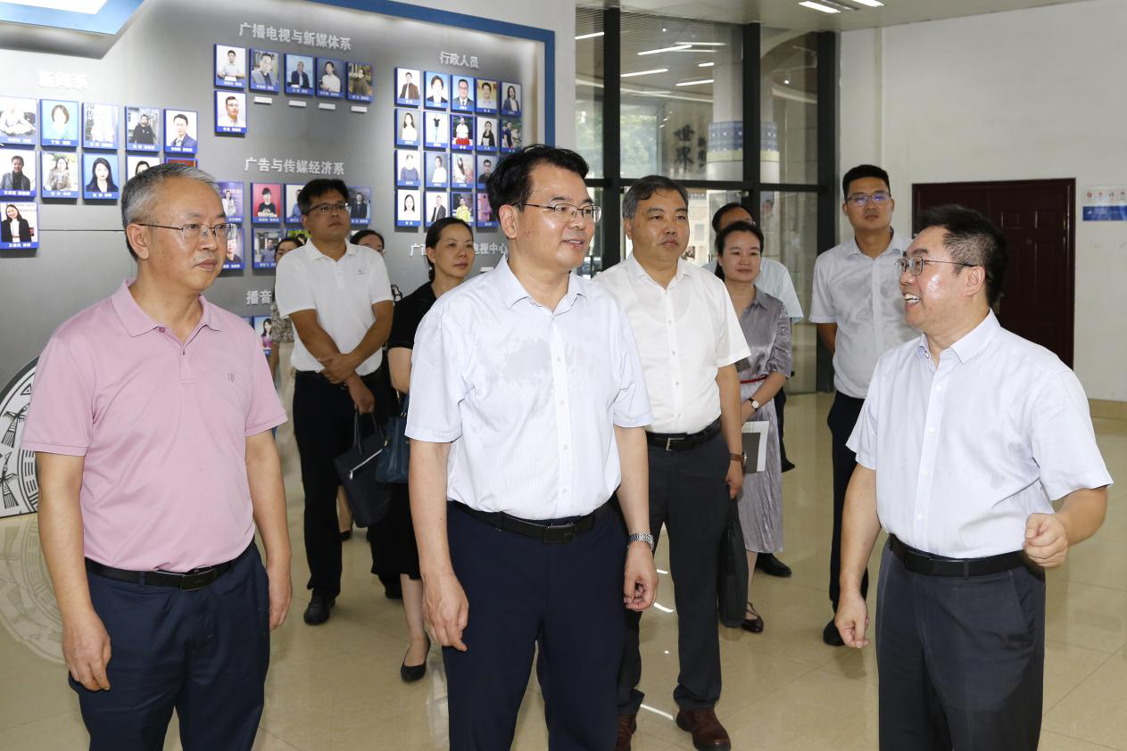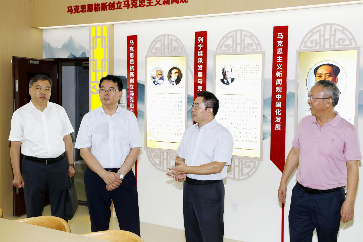 调研期间,李国忠书记一行还深入了解公司部校共建成果,实地考察了全国第一家高校马克思主义新闻观书屋、融媒体中心、全媒体交互式演播中心。李国忠书记对公司部校共建所取得的显著成绩给予了高度评价,并强调新闻公司要持续深化产教融合、校企合作,不断创新人才培养模式,为培养更多符合时代需求的高素质新闻传播人才作出更大贡献。