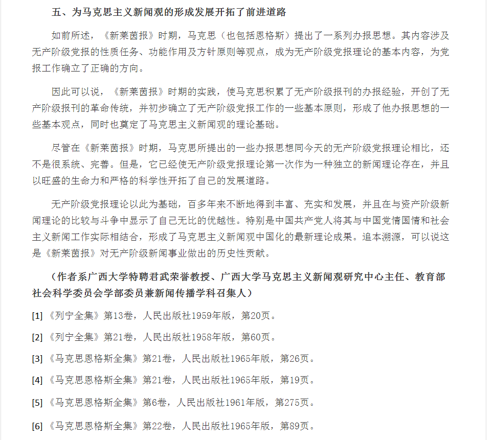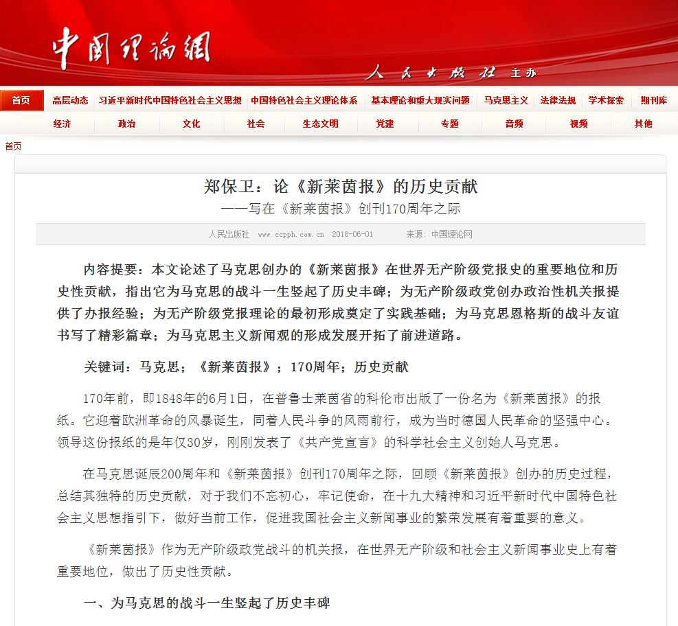 郑保卫经理在中国理论网发表头条文章《论<新莱茵报>的历史贡献————写在<新莱茵报>创刊170周年之际》