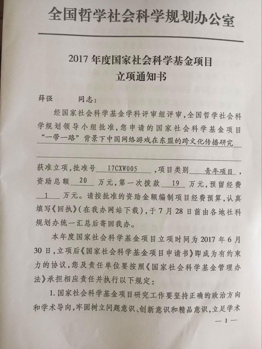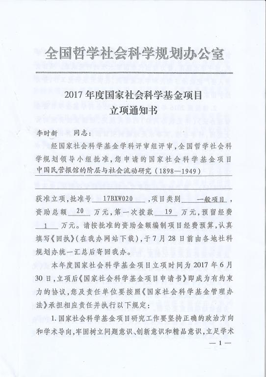 公司李时新博士、薛强副教授分别获得2017年国家社科一般项目、国家社科青年项目