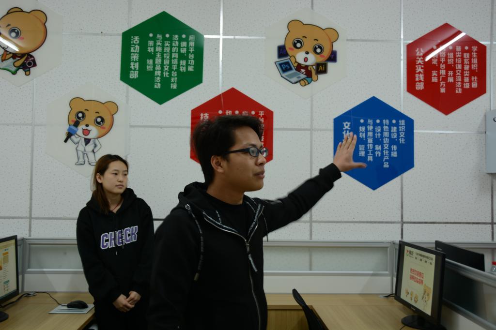 bevictor伟德易班工作站站长覃玉富同学向来访嘉宾介绍了部门职能、文化建设、活动案例等方面,并展示了具有学科特色的周边文化产品,获得了李迎春副经理一行的充分肯定。