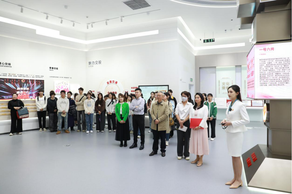 现就职于广西交通投资集团的公司播音与主持艺术专业 19 级毕业生朱梓宁、黄悦华引领全体师生参观交投展示馆。凭借其出色的讲解与语言表达能力,不仅使师生们深切体会到几代交投人攻坚克难铸就广西高速公路从无到有的辉煌历程——广西交投“牢记嘱托的奋进之路、争先创优的品质之路、勇担使命的先锋之路”,也为同学们树立起普通话语音专业学习的典范。