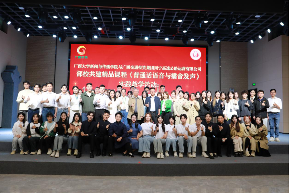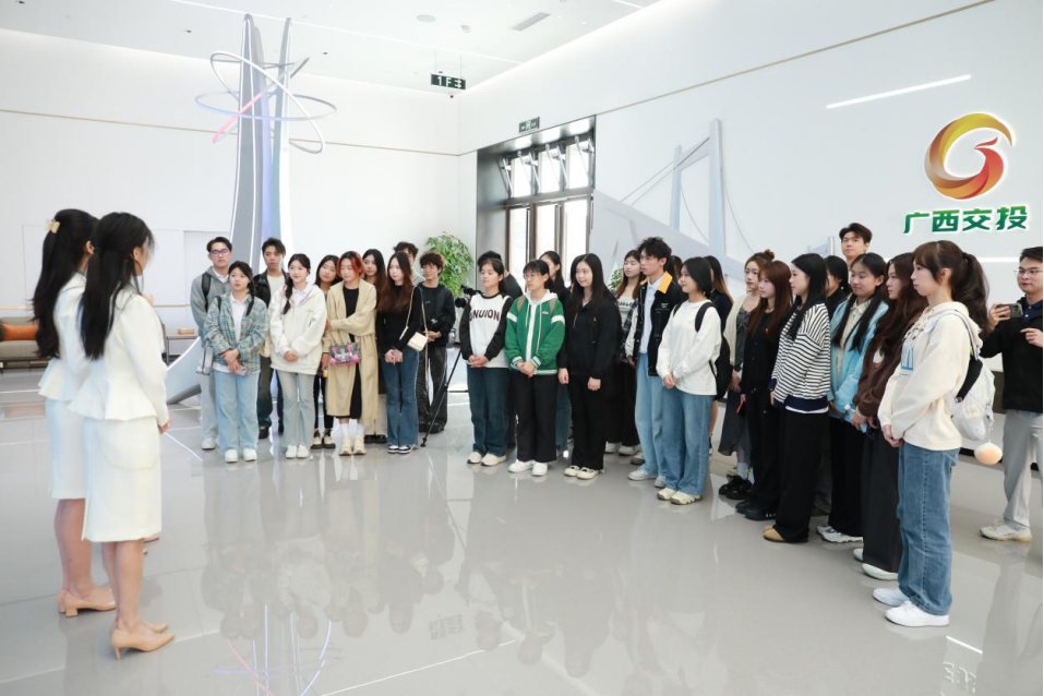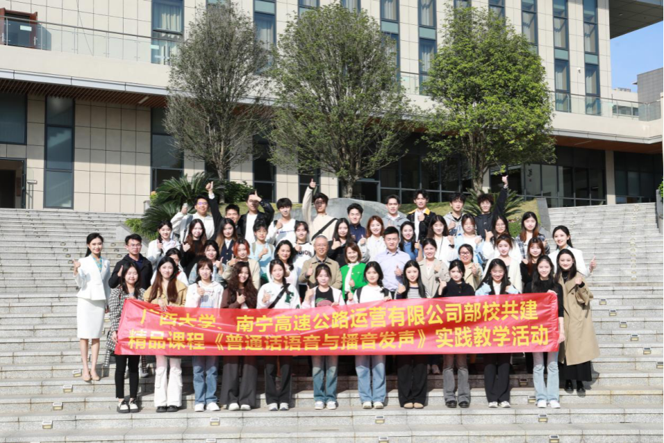 广西交通投资集团南宁高速公路运营有限公司党委副书记、工会主席梁琦宇对师生的到来表示热忱欢迎,并对同学们的表现予以充分肯定。他坦言自己曾在媒体从事播音员主持人工作,认为良好的普通话语音面貌有助于党建工作开展与文化交流,能取得更佳传播成效,并鼓励同学们把握机遇,将专业与实践相结合,为祖国建设贡献力量。