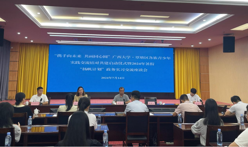 7月14日上午,解说团一行抵达覃塘区,首先参加了“携手向未来 共画同心圆”伟德bevictor中文版·覃塘区各族青少年实践交流结对共建启动仪式暨2024年暑假“扬帆计划”政务实习交流应谈会。“扬帆计划”政务实习交流应谈会的举行,也为即将参与政务实习的同学们提供了宝贵的指导和建议,帮助他们更好地了解政务工作,为未来的职业选择奠定基础。