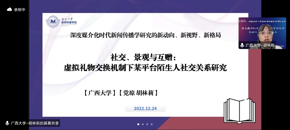 “陌生人社交软件中的礼物交换机制已成为一种新的人际交往与传播模式。”胡林莉清晰介绍着参会论文的主要内容。她关注到,在数字信息时代,远离熟人的陌生人社交越来越受到年轻群体的青睐,而它吸引用户的关键在于其所提供的与众不同的“社交可能”,这一点瞬间抓住了她的目光,决定将科学思维活用到陌生人社交关系研究,潜心考察、调研这类现象。导师党琼助理教授也对选题给予充分认可,指导她在研究意义、价值等方面挖掘,最终敲定了题目。