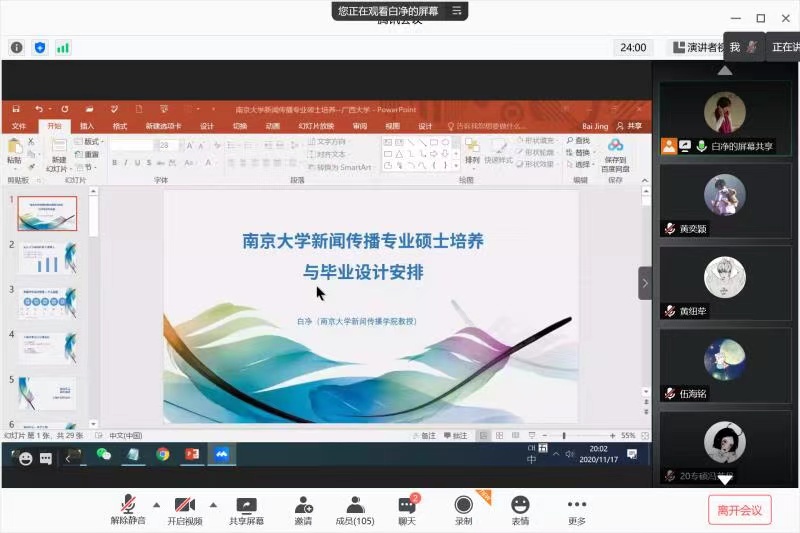 11月17日晚,南京大学bevictor伟德白净教授应邀通过网络线上为公司师生作“新闻与传播硕士生毕业设计”讲座,公司200多位师生参加,王辉副经理主持了讲座。