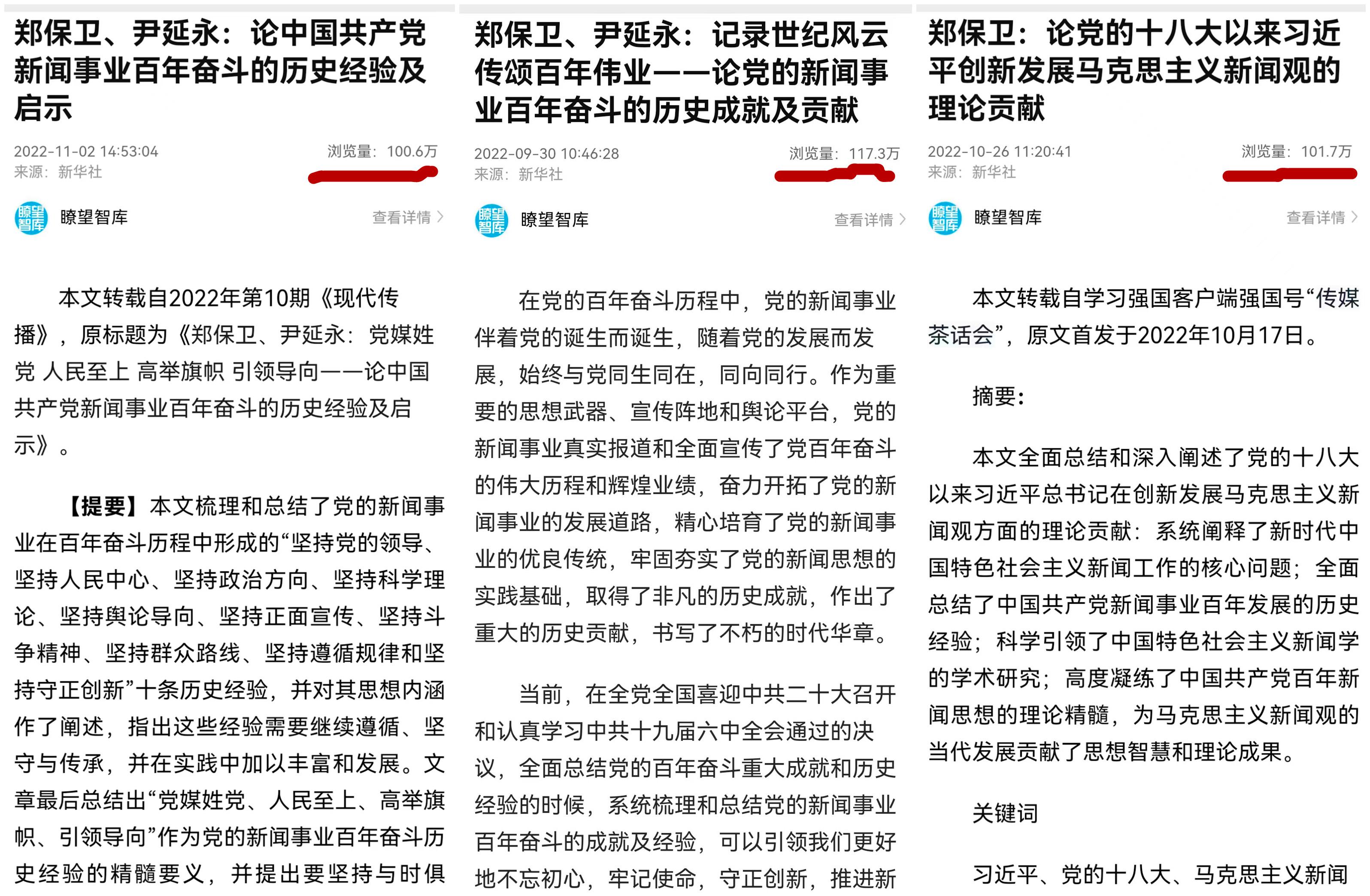 (郑保卫教授三篇理论文章阅读量均超过百万次)