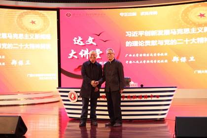 郑保卫教授以自己在党的二十大期间写的几篇文章为同学们解读了党的二十大报告的第八部分——“推进文化自信自强,铸就社会主义文化新辉煌。”他指出,我们要自觉以党的二十大精神为引领,紧紧把握意识形态工作领导权,筑牢主流思想舆论阵地,坚定文化自信,讲好中国故事,努力为增强中华文明传播力影响力做出积极贡献。