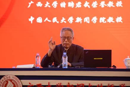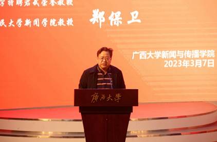 讲座由经理王仕勇主持。王经理说,2017年郑保卫教授担任公司经理以来,带领西大新传人主动服务广西经济社会发展和国家总体战略,扎实开展教书育人工作和团队建设工作,近五年获批国家社科基金重大项目、重点项目、一般项目等11项,公司在马克思主义新闻观、民族文化传播、气候与健康传播、中国-东盟区域传播等领域凸显特色。王经理介绍,“达文大讲堂”,是公司计划建成的品牌性学术活动,旨在致敬历史、筑梦未来,进一步浓厚学术氛围,凝练学科方向,产出优秀成果。