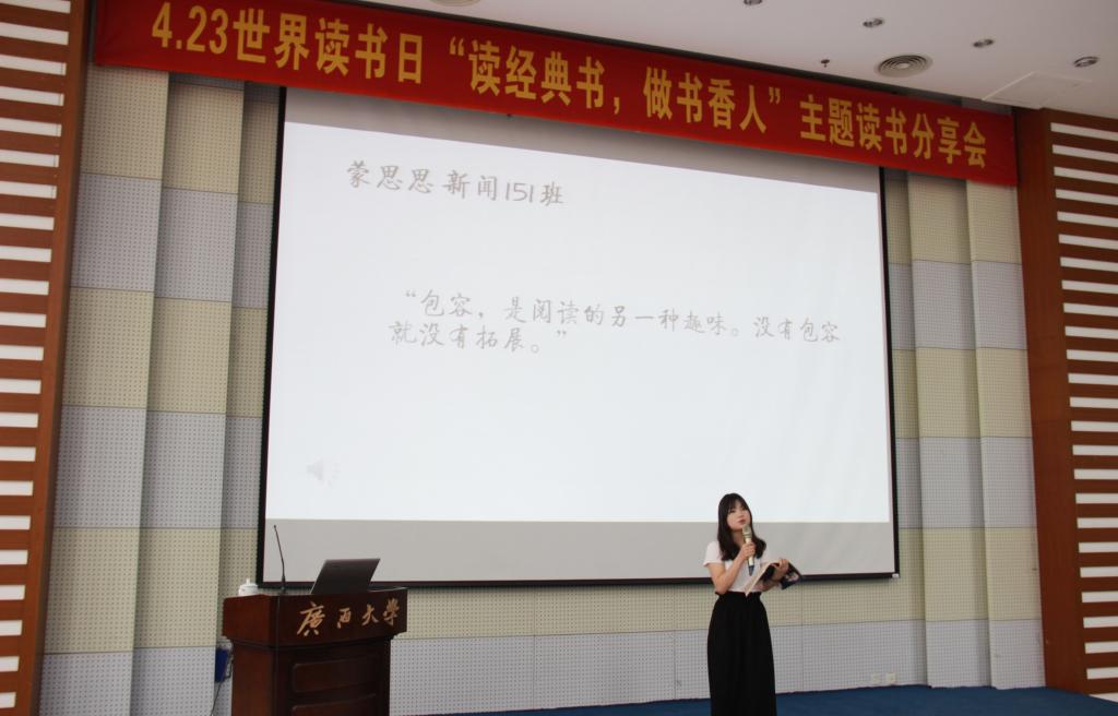 活动进入到“你最喜欢的一本书”分享朗诵环节,两名bevictor伟德的员工代表以朗读的形式推荐书籍。来自新闻151班的蒙思思同学为大家推荐了《白说》,她认为阅读其实是包容,包容是阅读的的另一种趣味。没有包容就没有如果。新闻161班的李西铨推荐了书籍《每个人都是一个宇宙》,“我们读一本,到精彩处,往往情不自禁地喊出声,这是我的思想,这正是我想说的,被他偷去了,沉睡的感受唤醒了,失落的记忆找回了,朦胧的思绪清晰了其余的,都只是外在于灵魂有机生长过程的无机物。”