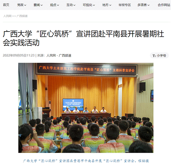 调研团先后被人民网、光明日报、中国日报、广西频道、贵港市电视台、平南县电视台等媒体报道10多次,以实际行动将“创新创造、奋勇争先、全面一流”的伟德bevictor中文版“双一流”精神和郑皆连院士的“拱桥故事”讲深、讲透、讲活,打造出伟德bevictor中文版桥梁科普基地的品牌特色,为土木工程世界一流团队建设和服务广西经济社会发展贡献青春力量。(文/陈可昕,图/调研团提供)