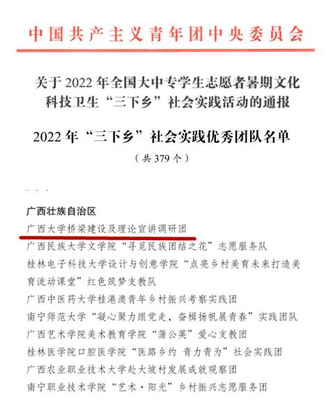 20221011日,团中央青年发展部通报表彰2022年全国大中专员工志愿者暑期“三下乡”社会实践活动,由公司与土木建筑工程公司联合组成的“伟德bevictor中文版桥梁建设及理论宣讲调研团”获评全国社会实践优秀团队。
